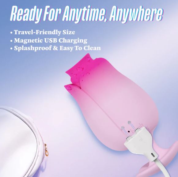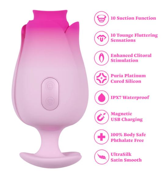 Let the Aria Tulip Trance elevate your intimate experiences to new heights. Inspired by the elegance of a blooming tulip, this innovative massager features 10 sensual sucking and tongue-fluttering sensations, delivering soft, precise stimulation for clitoral and nipple play. Its contoured heart-shaped base and tapered stem ensure smooth, seamless control that intuitively adapts to your touch. Beautifully designed to fit perfectly in the palm of your hand, the Tulip Trance is crafted from body-safe Puria® Platinum Cured Silicone with an UltraSilk® satin-smooth finish, offering a luxurious feel with every caress. With its IPX7 waterproof design, you can indulge in playful bliss in the bath or shower, while the magnetic USB rechargeable feature ensures it’s always ready for you and your next adventure. Perfect for solo play or exploring new sensations with a partner, the Tulip Trance is your gateway to blooming pleasure. Discover its versatility, beauty, and delight with every thrilling moment.