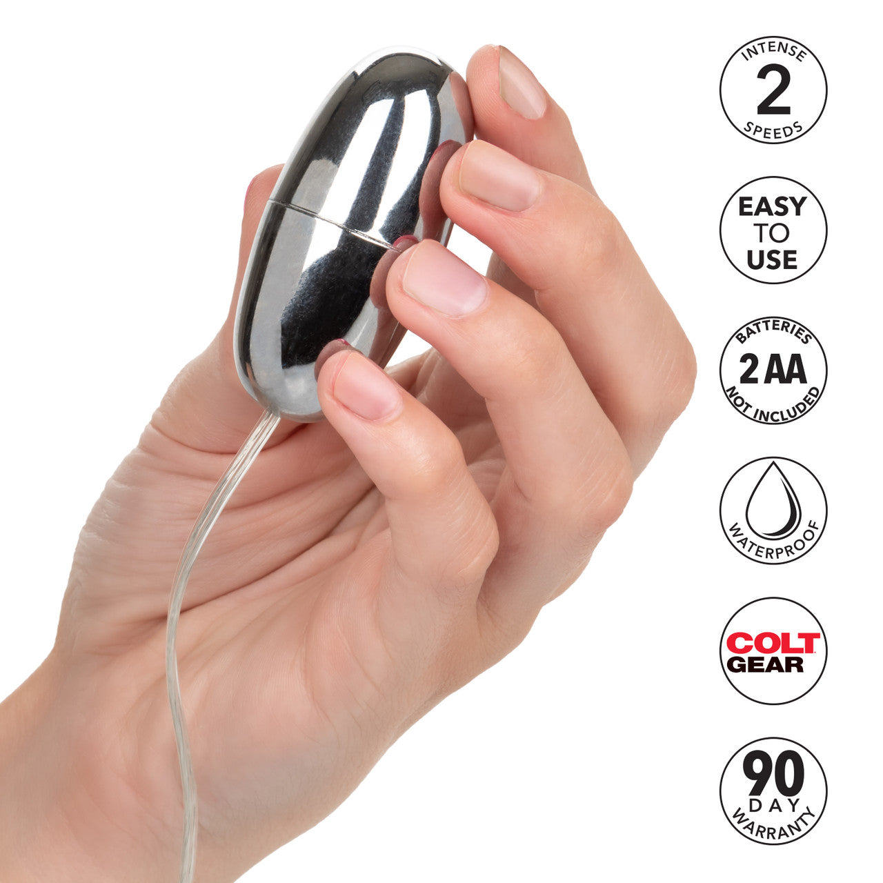 Colt Xtreme Turbo Bullet Vibrator from California Exotic Novelties. The Colt Xtreme Turbo Bullet Vibrator is a sexy, ergonomically designed universal Silver Bullet Vibrator. Featuring a waterproof power pack with 2 speed push button control, versatile vibrating stimulators do not get any better. The powerful multi-speed sensations will have you craving more. Crafted from high quality ABS Plastic with Silver Plating, you will be as safe as you are satisfied. For the ultimate in vibrating pleasure, you can not beat this bullet vibe. It will take you to thrilling levels of sensation and enjoyment. Wonderfully hedonistic, the Colt Xtreme Turbo Bullet Vibrator provides the perfect way to achieve gratifying pleasure. You will experience intensely satisfying stimulation with this sex toy, whether you are enjoying this bullet solo or with a partner. You will find powerful sensations and the utmost in sensual pleasure with this handy bullet vibrator. Colt Gear Xtreme power! Ergonomically designed universal Silver Bullet Vibrator, waterproof power pack with 2 speed push button controls. Safe and pure for body and pleasure. Made using phthalate free, non-toxic materials ABS Plastic with Silver Plating Bullet, ABS Plastic Controller. Vibrating sex toy requires 2 AA batteries not included. Do not leave batteries in the vibrator between uses. A water based lubricant is recommended. Colt Gear is a registered trademark for California Exotic Novelties. Sex toys and sexual wellness. 90 days warranty. Categories: Vibrators, Bullets and Eggs Vibrators, Sex Toys for Women, Vibrating Bullets and Eggs. 2024.