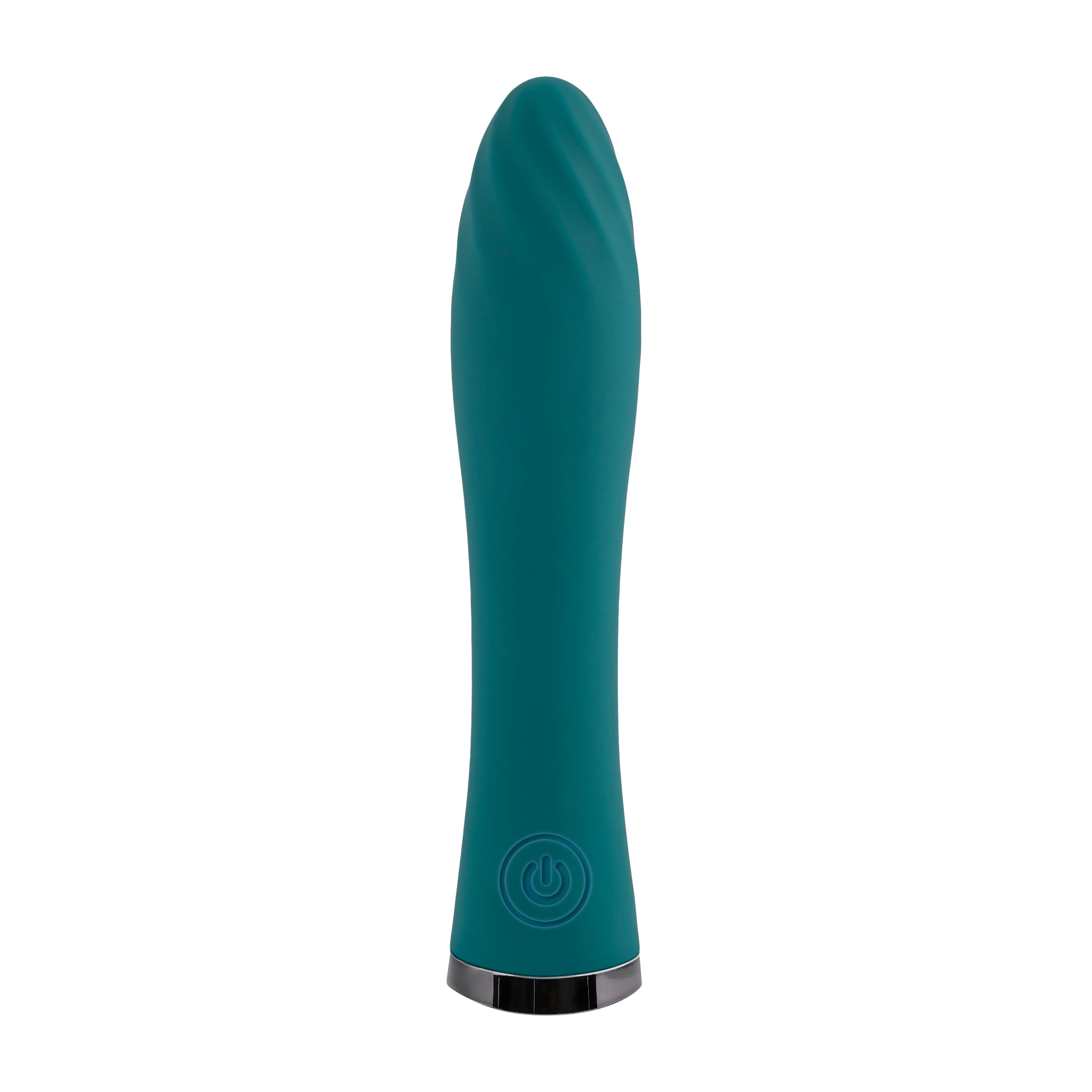 Evolved Ultra Wave Green Vibrator. The Ultra Wave at just over 5 inches tall, this traditional vibrator is petite but powerful with 5 patterns and intensities to accelerate your pleasure. The elegant shaft swells in the center and tapers to a rounded tip adorned with swirling textures to add delicious sensations to your experience. A 1 button control panel lights up for easy navigation while the black chrome finished base allows you to stand this sex toy upright on your nightstand. Fully water submersible, rechargeable and easy to clean.