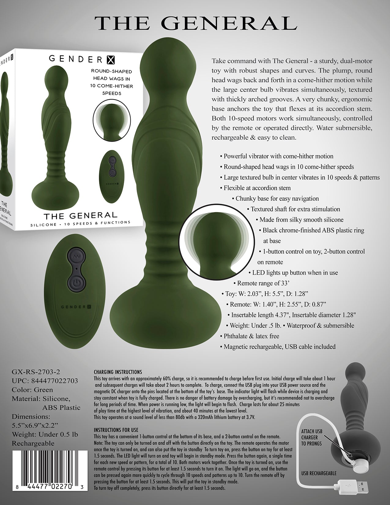 Gender X The General Round Shaped Head Wags and 10 Come Hither Speeds Prostate Massager from Evolved Novelties. Take command with The General Vibrator a sturdy, dual motor toy with robust shapes and curves. The plump, round head wags back and forth in a come hither motion while the large center bulb vibrates simultaneously, textured with thickly arched grooves. A very chunky, ergonomic base anchors the toy that flexes at its accordion stem. Both 10 speed motors work simultaneously, controlled by the remote or operated directly. Water submersible, rechargeable and easy to clean.