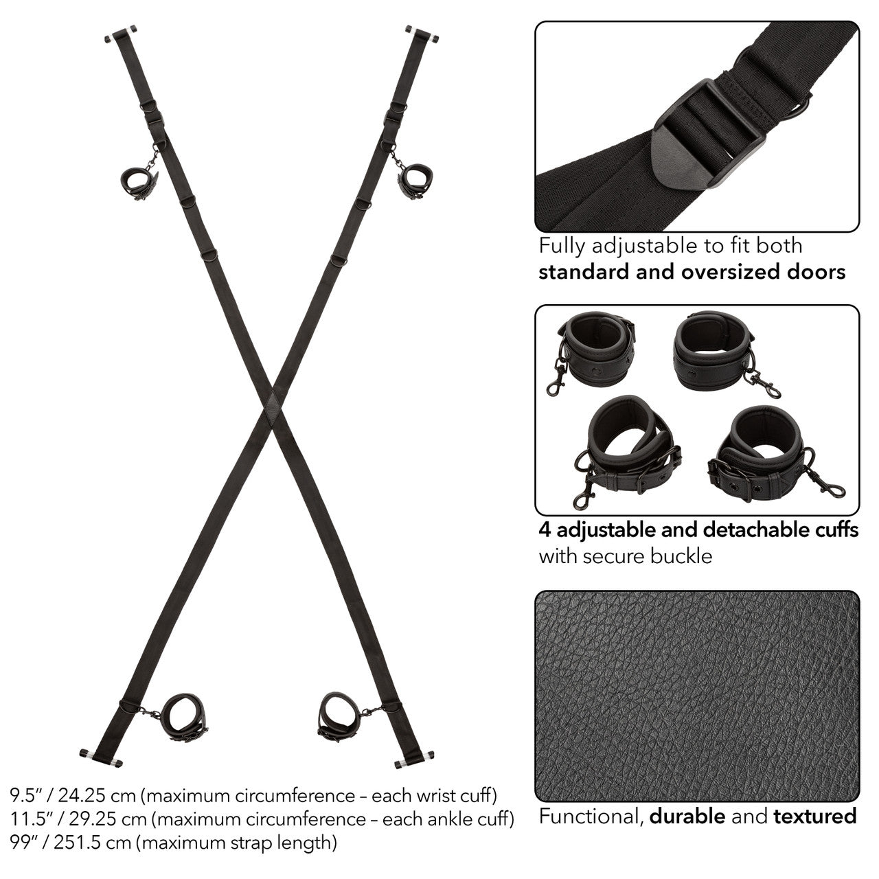 The Nocturnal™ Collection Over The Door Cross is fully adjustable to fit both standard and oversized doors, ensuring a versatile and secure experience. It comes with 4 adjustable and detachable wrist and ankle cuffs, each featuring secure buckle closures for comfortable and controlled restraint. Universal clasps and D-rings with a swivel design offer full dexterity, enabling a wide range of movement and positions.