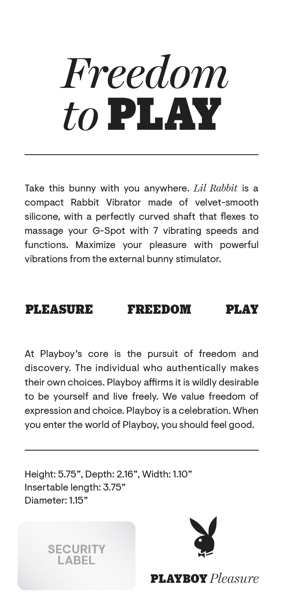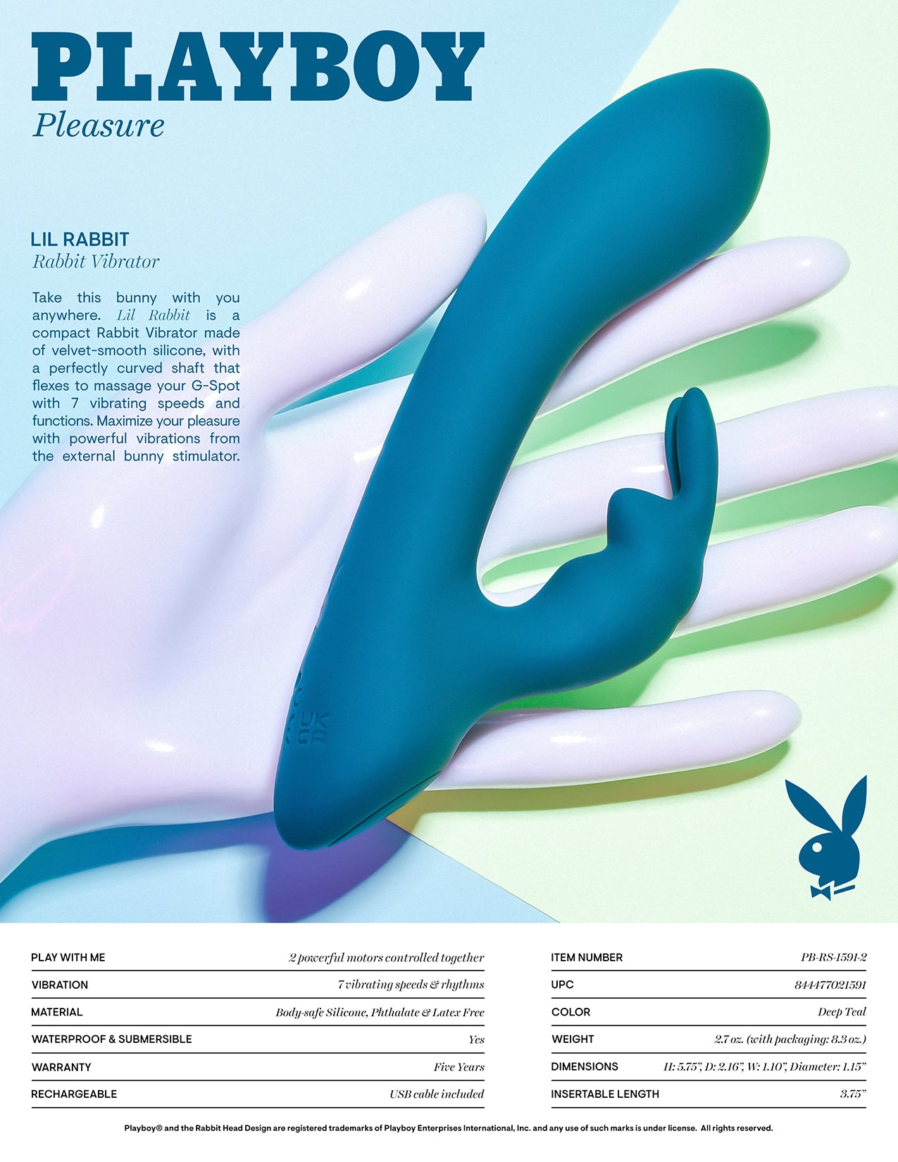 Features: compact dual motor Rabbit Vibrator. Materials: Body safe Silicone, Phthalate free, Latex free. Size: height 5.75 inches, depth 2.16 inches, width 1.10 inches, insertion length 3.75 inches, diameter 1.15 inches. 2 powerful motors controlled together. 7 vibrating speeds and functions. Single push button control. Hold power button for 2 seconds to turn on/off. USB Rechargeable. 40 minutes run time on high power. 80 minutes run time on low power. Charging time 60 minutes. Waterproof vibrations. Submersible for easy cleaning and bathtub play. 5 years manufacturer's warranty. Care: compatible with water based personal lubricants. Clean with toy cleaner and rinse with warm water. Pat dry before storing. Please note contains Lithium and must be recycled. Lithium Li-Ion battery. Categories: Vibrators, Rechargeable Vibrators, G-Spot Vibrator, Sex Toys for Women, G-Spot Flexible Vibrators. Play with me. Playboy and Rabbit Head design are registered trademarks of Playboy International. All rights reserved. 2023.