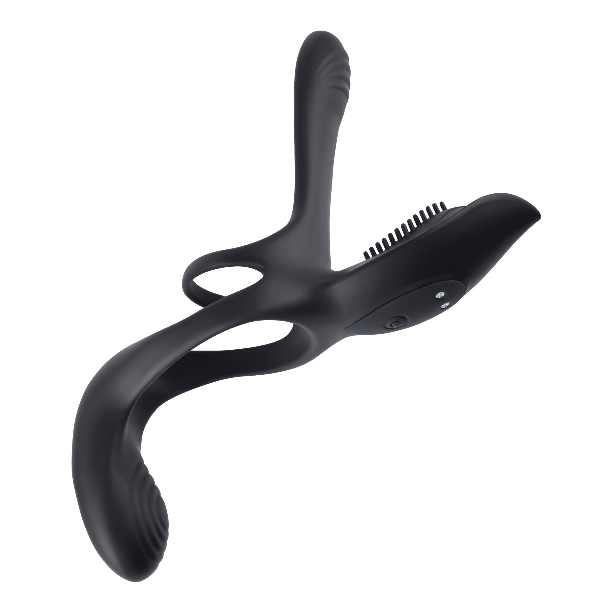 Playboy The 3 Way Vibrating Cock Ring from Evolved Novelties. The freedom to play is yours with Playboy Pleasure. Experience a whole new way to play with The 3 Way, a unique Cock Ring made of velvet smooth Silicone. The double loop vibrates as it supports your erection. 3 textured feelers with 10 speeds and rhythms offer you endless possibilities for pleasure. The curved, girthy lower arm stimulates the perineum and balls. The vibrating sheath above the loop adds girth, support and stimulation for both partners during play. Thoughtfully designed textures and nubs offer extra sensations as the upper arm provides clitoral stimulation to a partner. Experience all The 3 Way has to offer hands free with the easy to use remote control.