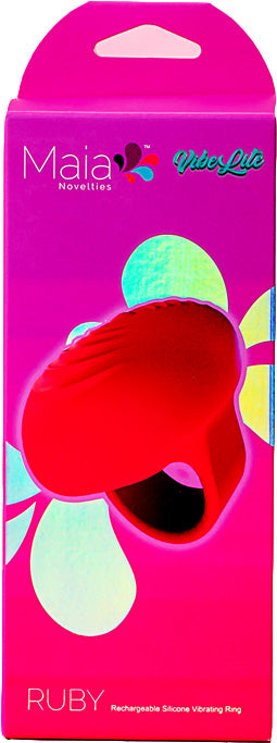 Vibe Lite Ruby Rechargeable Vibrating Finger Ring Red from Maia Toys. Put a ring on it - takes on a whole new meaning with the Maia Novelties Ruby. Our newest release Vibelite product includes 10 vibrating functions. Turn your fingers into your vibe with Ruby on your finger. Ruby is coated in 100% medical grade Silicone and sports an IPX7 waterproof rating, which means Ruby can be used in your hot tub or spa. Ruby measures approximately 2 inches long and is 1.1 inches across. Includes a USB Charging Cable.