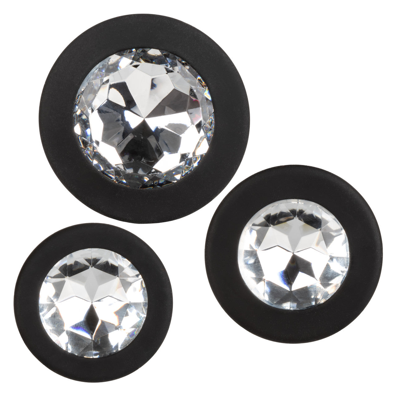Silicone Gem Anal Kit Black from California Exotic Noveltiess. Open the door of thrilling anal sensation with the Silicone Gem Anal Exerciser Kit. This glamorous Anal Kit includes a set of 3 graduated Butt Plugs with a gem base to let you safely and comfortably increase passionate anal stimulation. To enjoy everything the exhilarating world of Anal Play has to offer, training is in order to ensure total safety and satisfaction. Each probe in our kit gradually increases in length and girth for superb pleasure at any level of pleasure play. While each increase of your training expands your horizons, use the sparkling Gem adorned base for steamy stimulation, effortless insertion and gentle removal. The flexible Probes are made from a smooth, seamless Satin Finish Silicone. This body safe material is unscented and phthalate free to keep your most sensitive spots happy and healthy.
