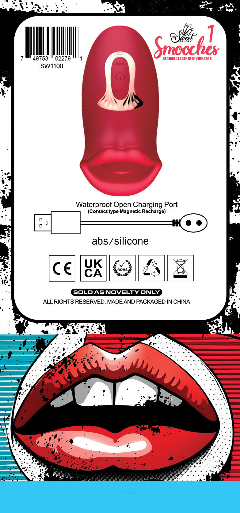 Specifications: Size: 25 x 8 x 8 cm Material: Silicone, ABS Phthalate & Latex Free Run Time: 60 Minutes Charge Time: 120 Minutes What's Included 1x Smooches #1 Clitoral Vibrator: Your new favorite companion, ready to deliver endless pleasure. 1x USB Charging Cable (30 inches - Adapter Not Included): Convenient and easy charging. 1x User Manual: Comprehensive guide to get you started.